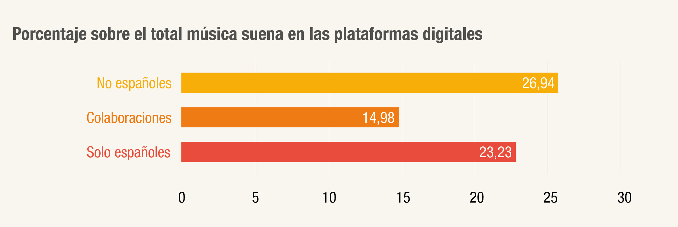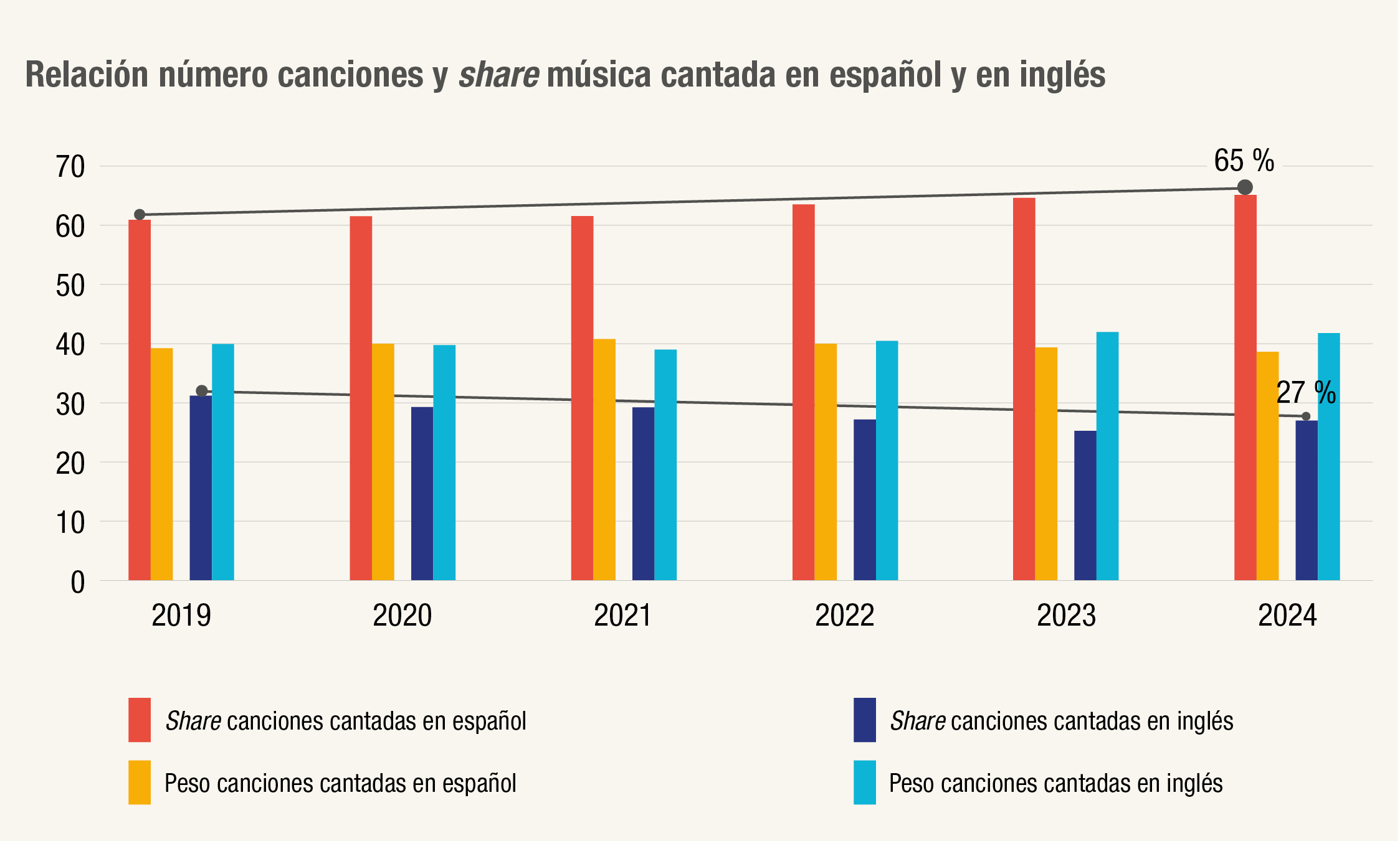 En el lado opuesto, se sitúa la música en inglés que sigue siendo la más numerosa en cuanto a cantidad en las plataformas digitales, pero no así en relevancia. De hecho, en 2024 solo supuso el 27% del share, menos de la mitad de reproducciones que las de la música cantada en español.