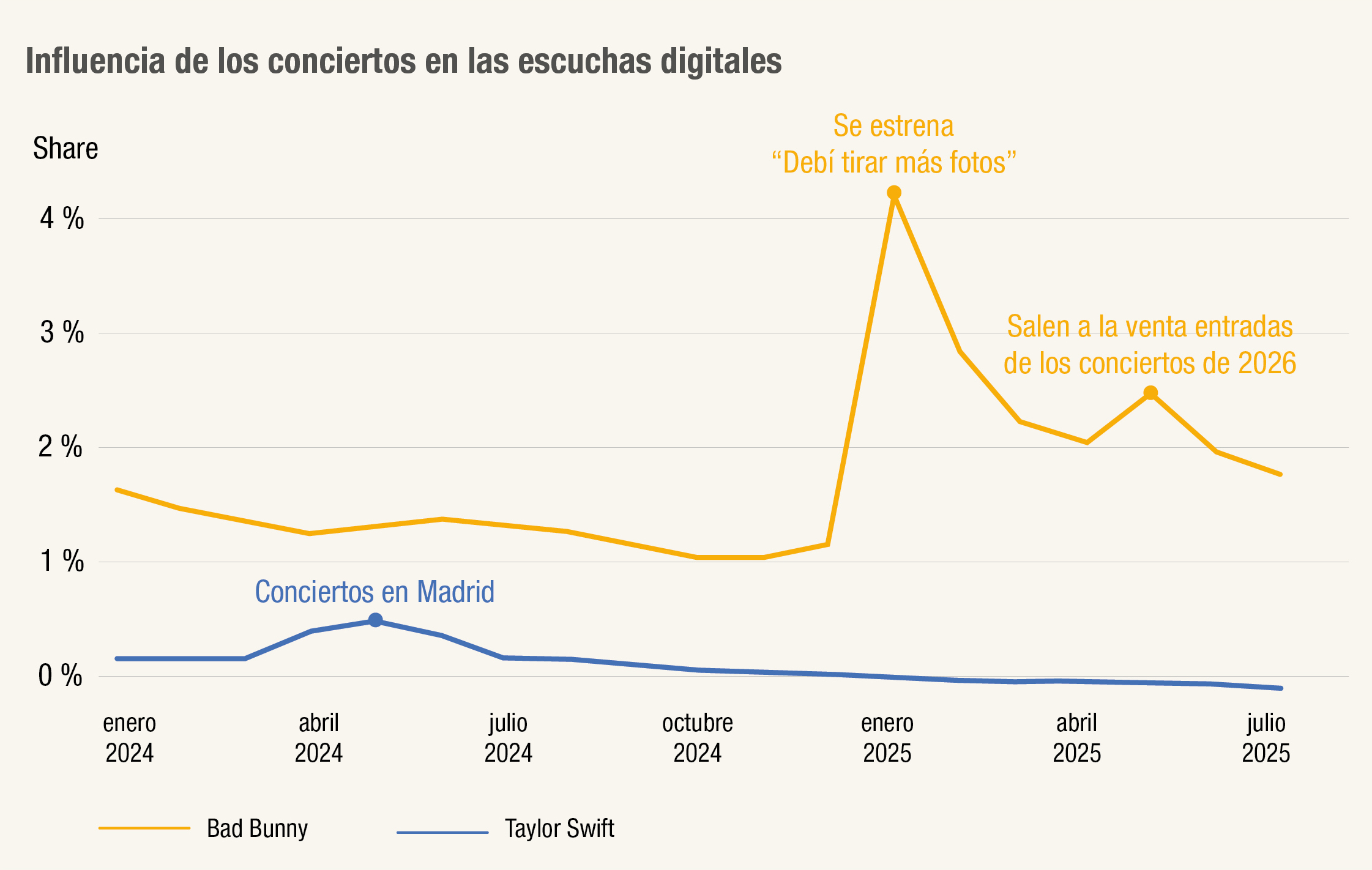 Como ejemplos paradigmáticos, las giras de Taylor Swift y Bad Bunny confirman esta tendencia. Así, los datos de AIE sobre consumo digital en España confirman un claro aumento de las reproducciones en plataformas de los temas de Taylor Swift en mayo de 2024, coincidiendo con las actuaciones que ofreció en Madrid, para posteriormente bajar a los datos habituales apenas unas semanas después de las mismas. De manera análoga, el repertorio de Bad Bunny siguió la misma inercia cuando lanzaron la campaña asociada a la venta las entradas para los conciertos que ofrecerá en Madrid y Barcelona con motivo de su gira Debí tirar más fotos en 2026, con un pico de consumo que se estabiliza en los valores habituales después de tres semanas de la campaña.